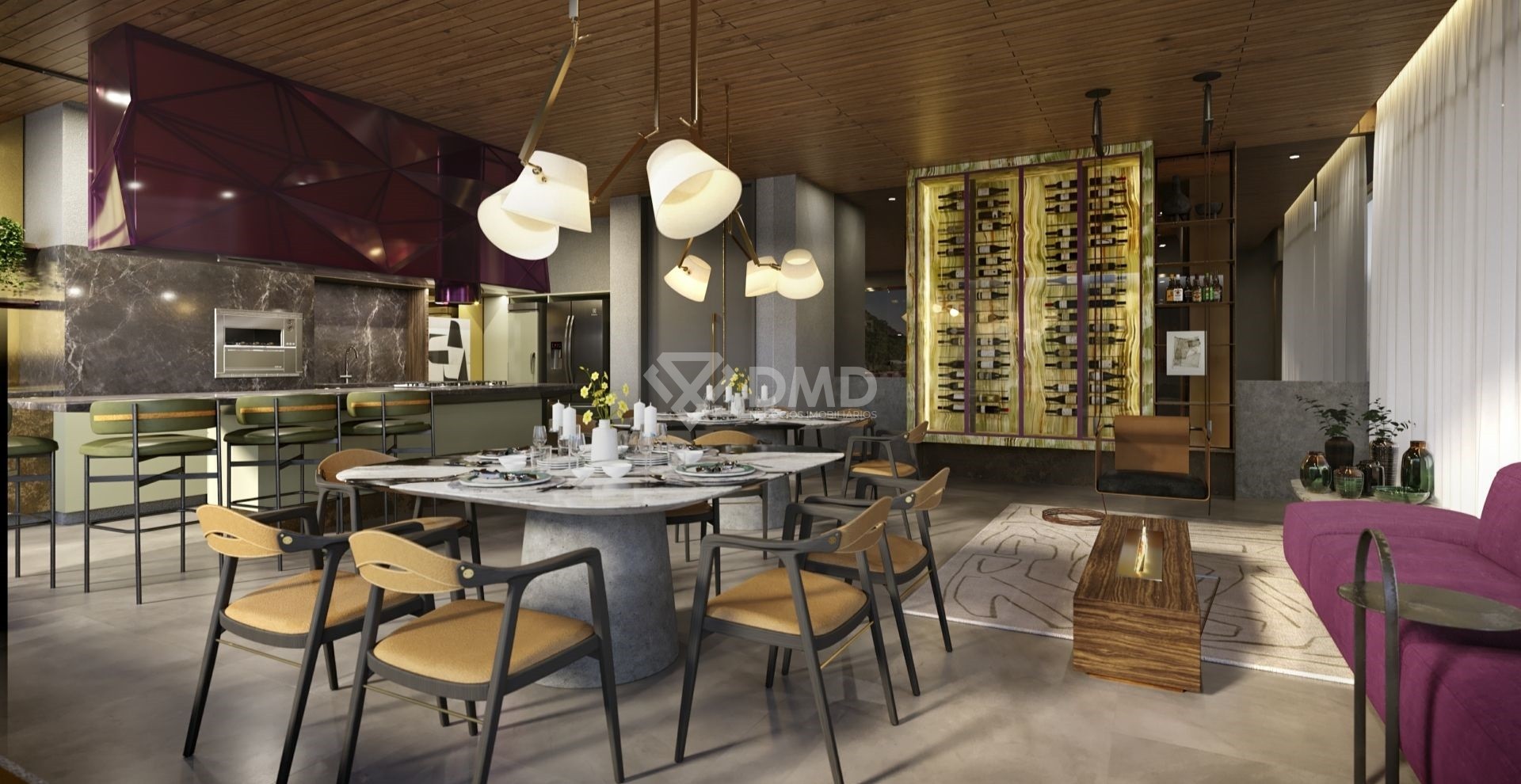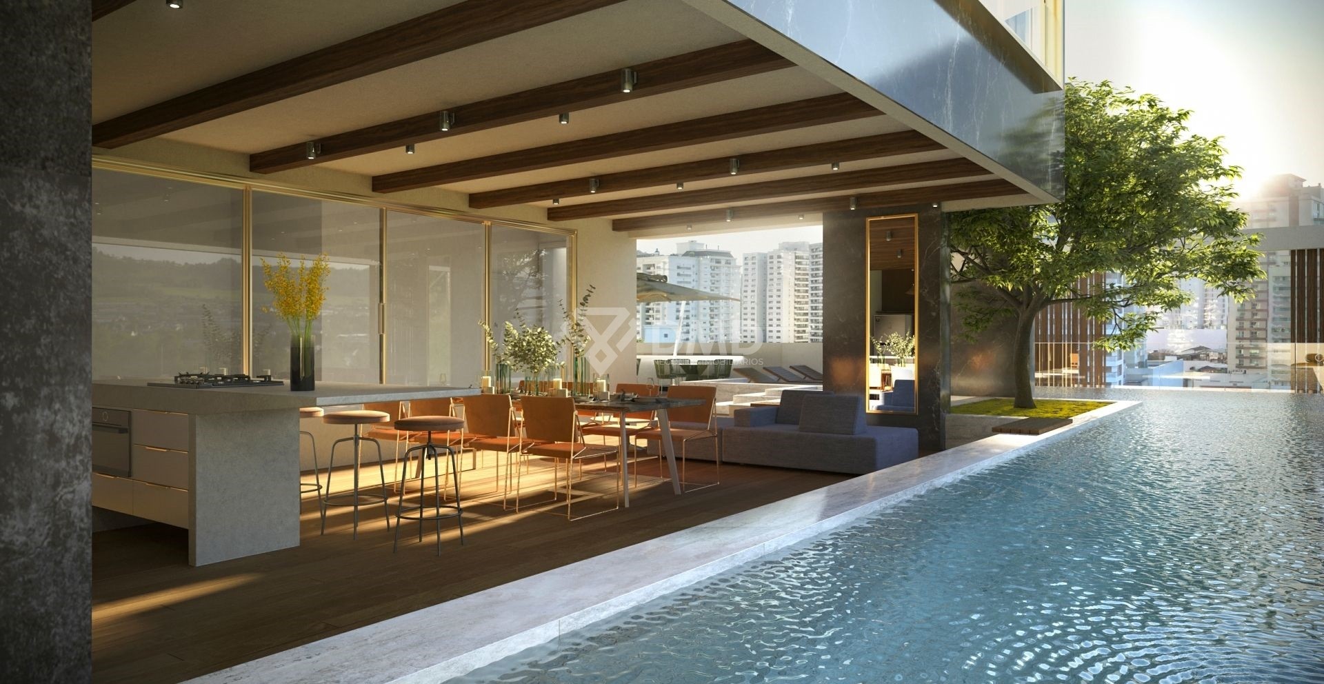 Área de lazer mobiliada, decorada e equipada com padrão D6 Empreendimentos