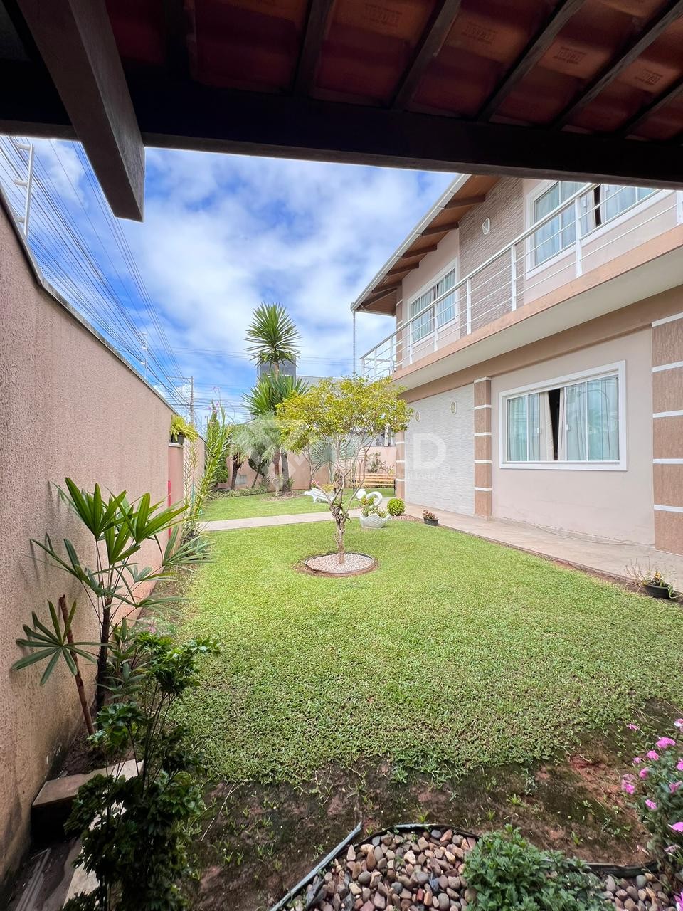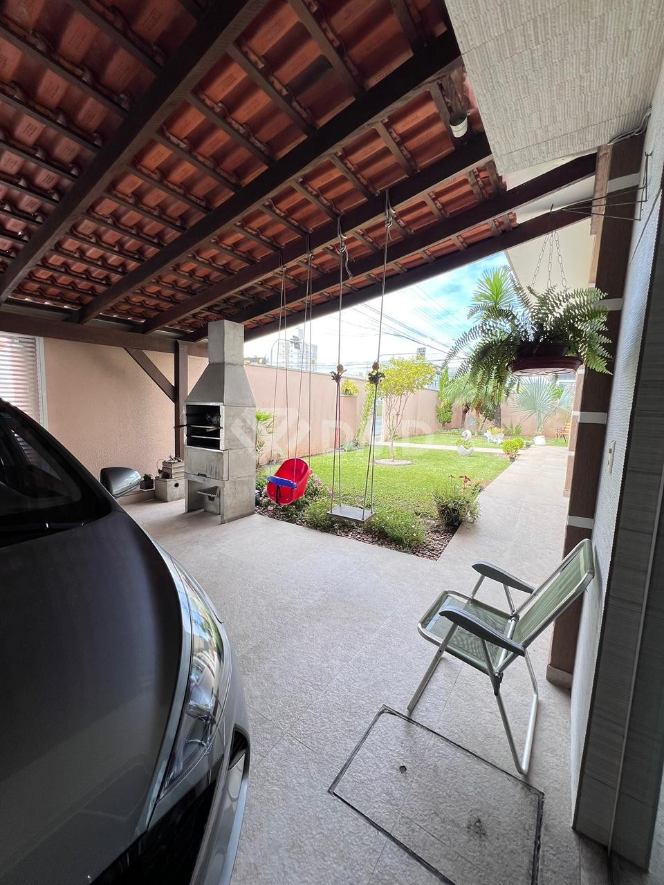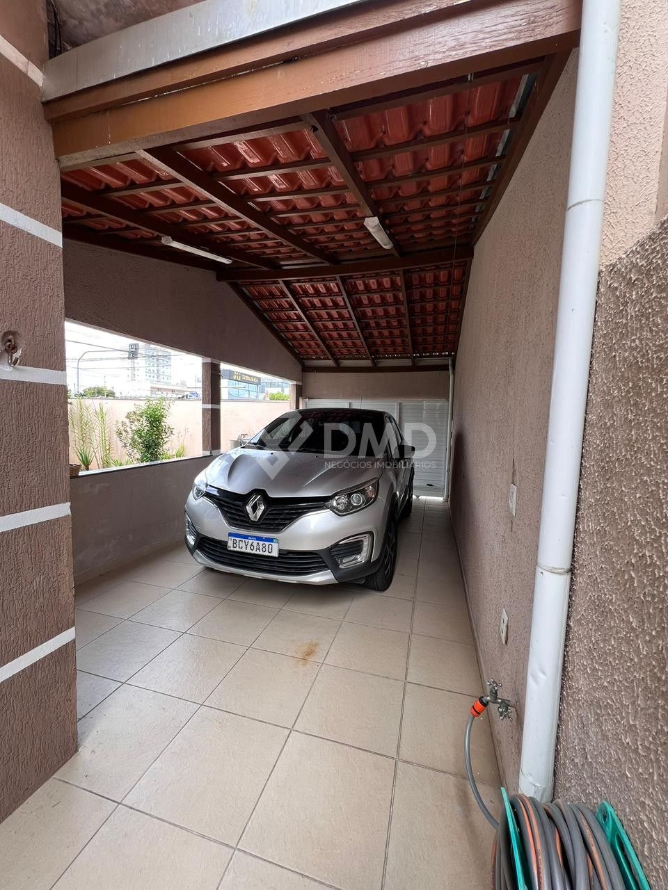 O terreno possui amplo espaço externo com jardim e duas garagens, garantindo praticidade e conforto para os moradores.