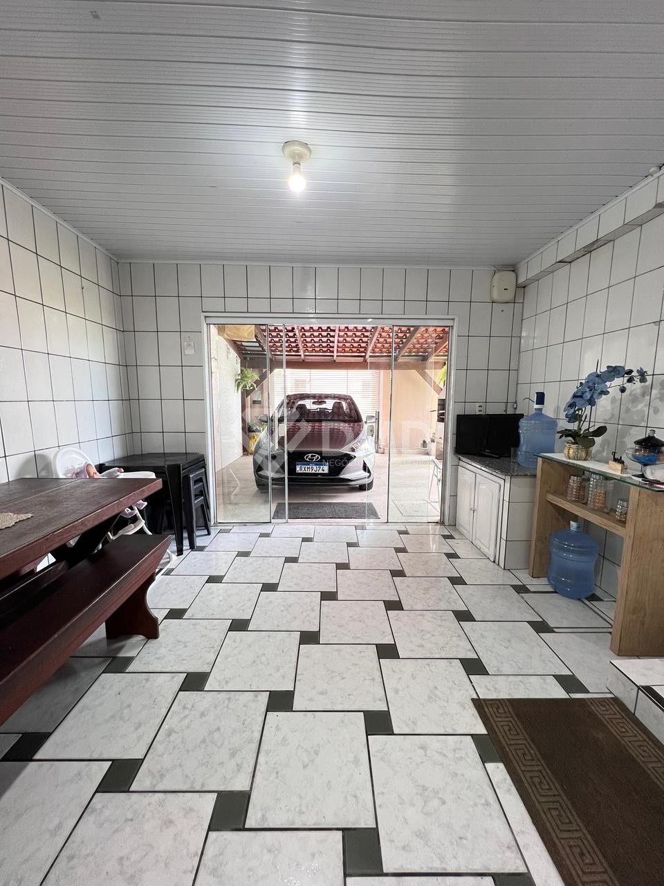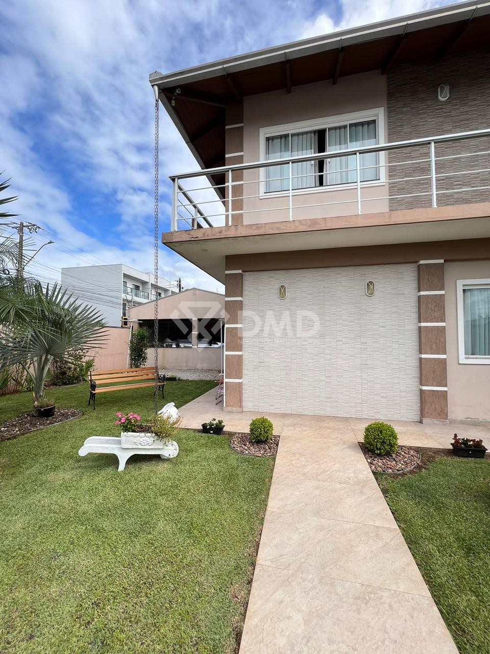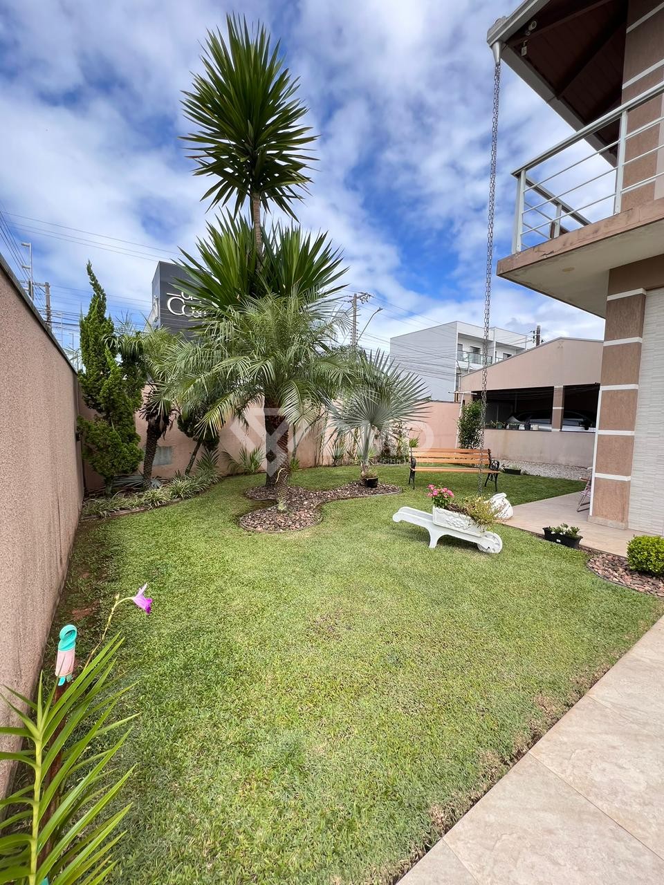O terreno possui amplo espaço externo com jardim e duas garagens, garantindo praticidade e conforto para os moradores.