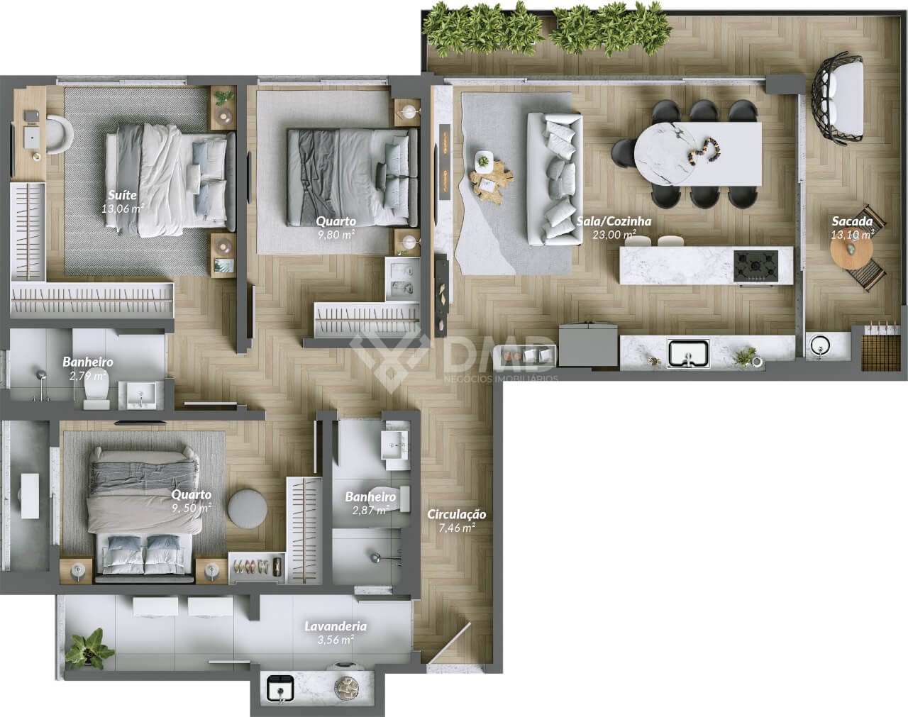 A unidade conta com 1 suíte + 2 dormitórios, além de ambientes bem distribuídos, proporcionando conforto, funcionalidade e integração dos espaços.